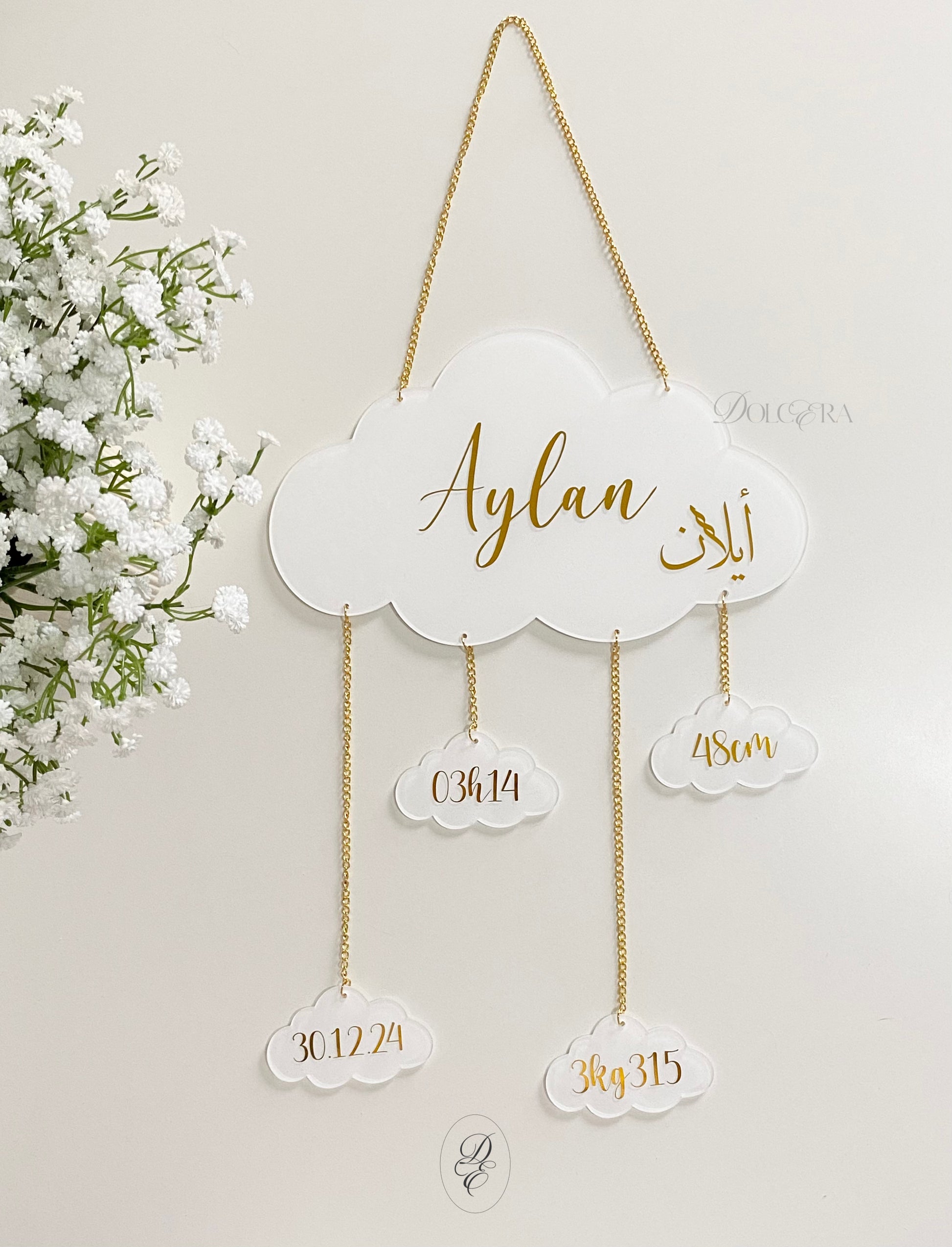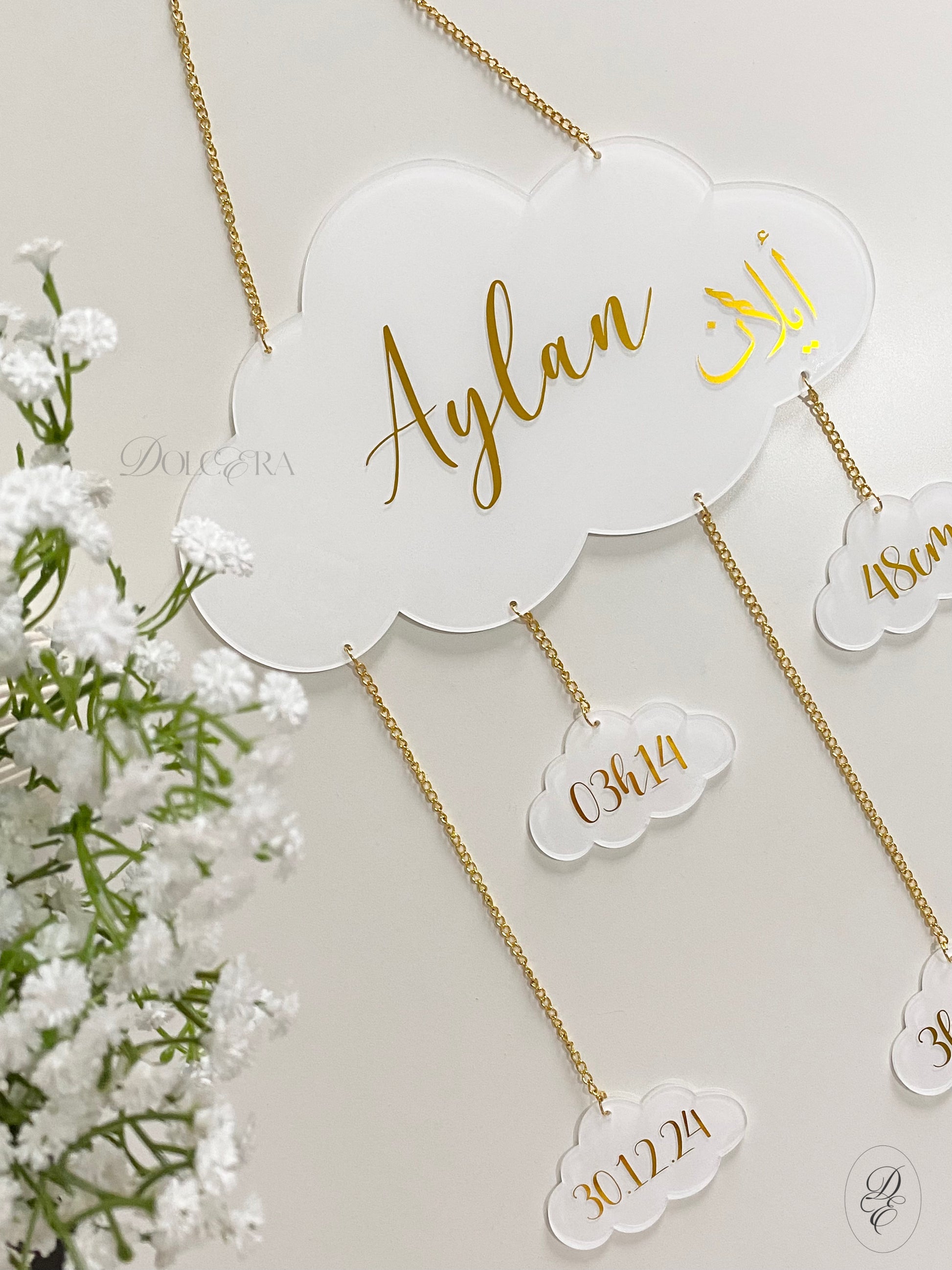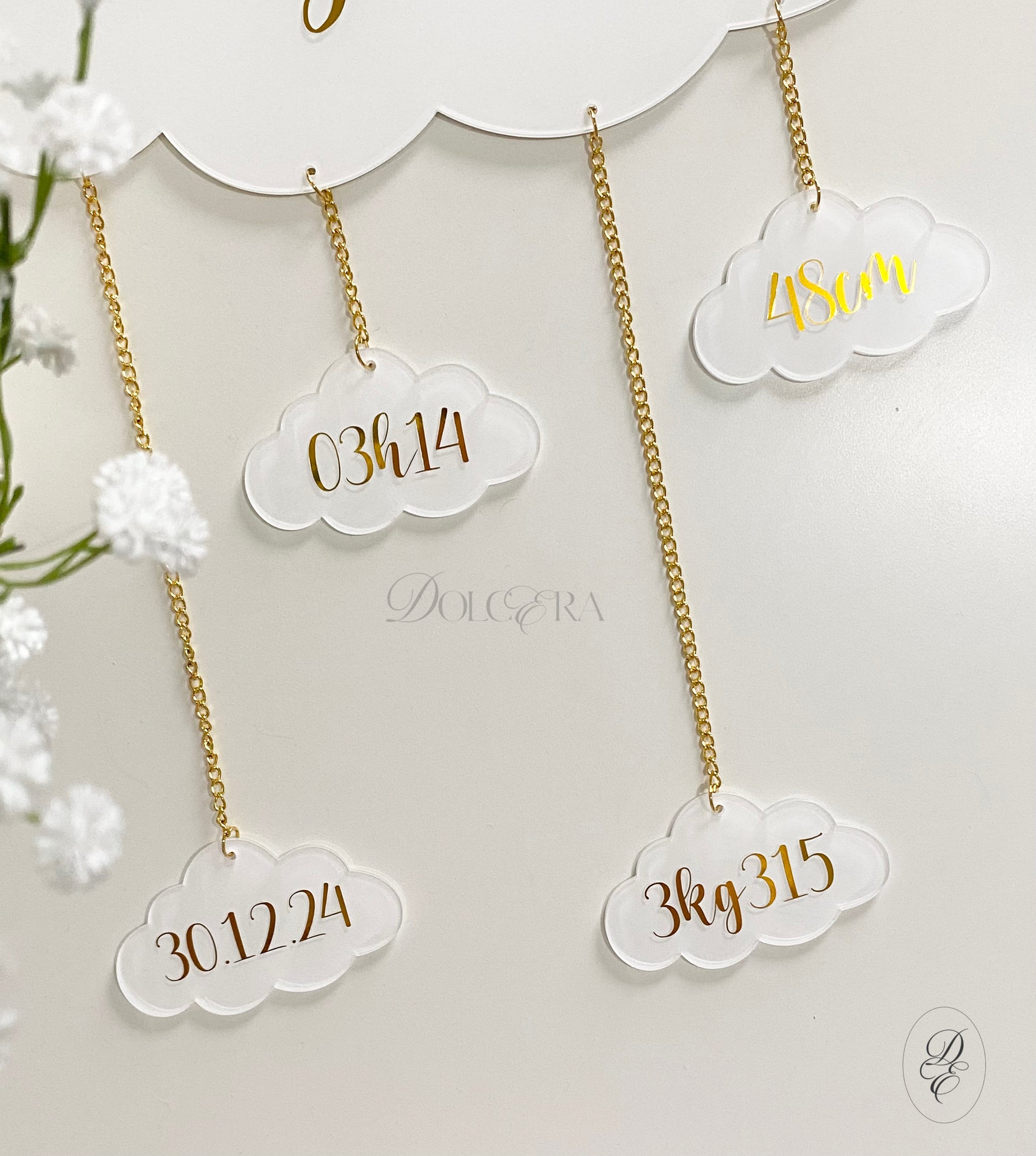 Célébrez l’arrivée de votre petit trésor avec nos nuages personnalisés avec toutes les informations importantes de la naissance de bébé. Ces nuages, suspendus et prêts à être accrochés au mur, apportent une touche douce et poétique à la chambre de bébé tout en offrant un souvenir précieux du jour spécial de sa naissance. Un cadeau original, émotionnel et décoratif, parfait pour les parents qui veulent garder un souvenir unique de ce moment inoubliable.