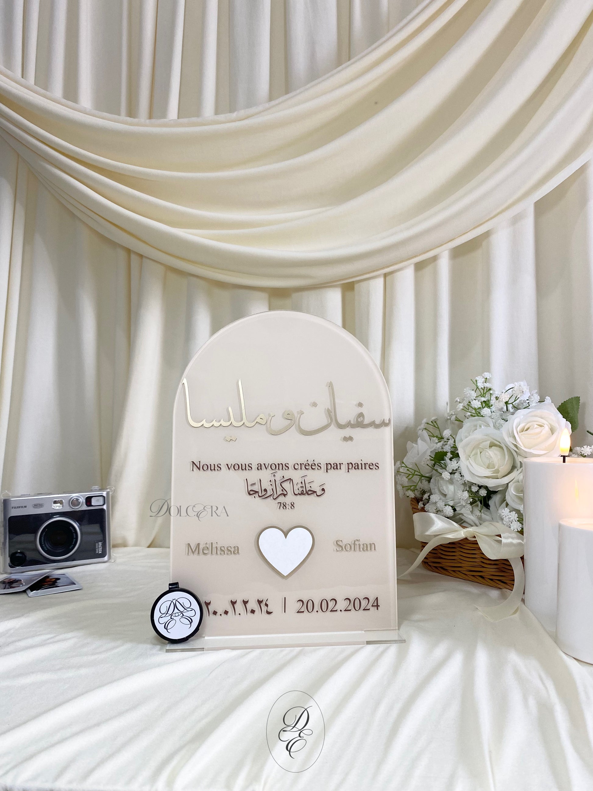 Cette arche sur socle est conçue spécialement pour les mariés, leur permettant de laisser une empreinte digitale symbolique et unique lors de leur mariage. Ce geste simple mais significatif crée un souvenir visuel qui représente l’union des deux cœurs.