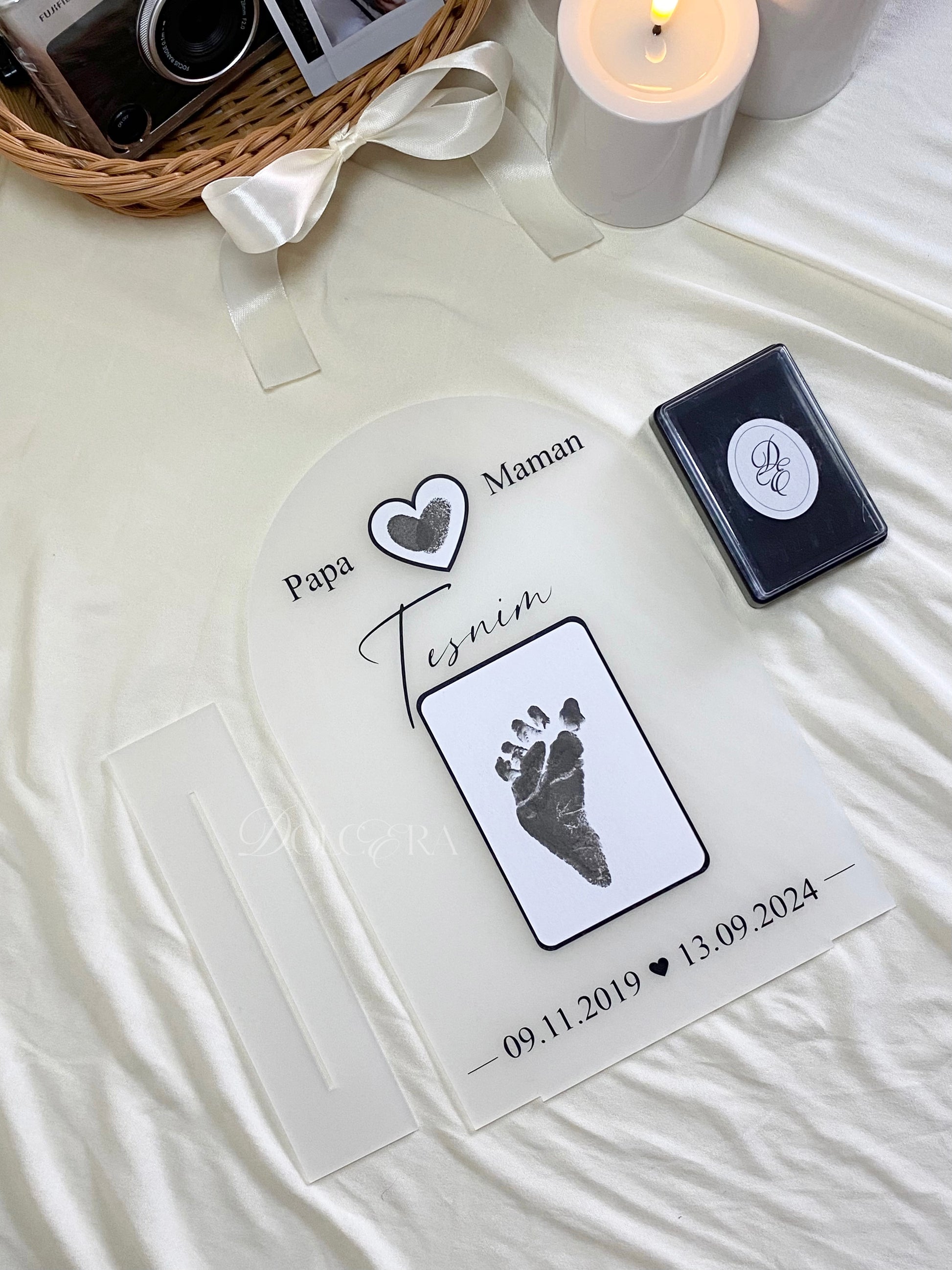 Cette création de naissance personnalisée capture l’empreinte du pied de votre bébé, accompagnée des empreintes des parents formant un cœur, pour en faire un souvenir éternel, chargé d’émotion et de douceur.