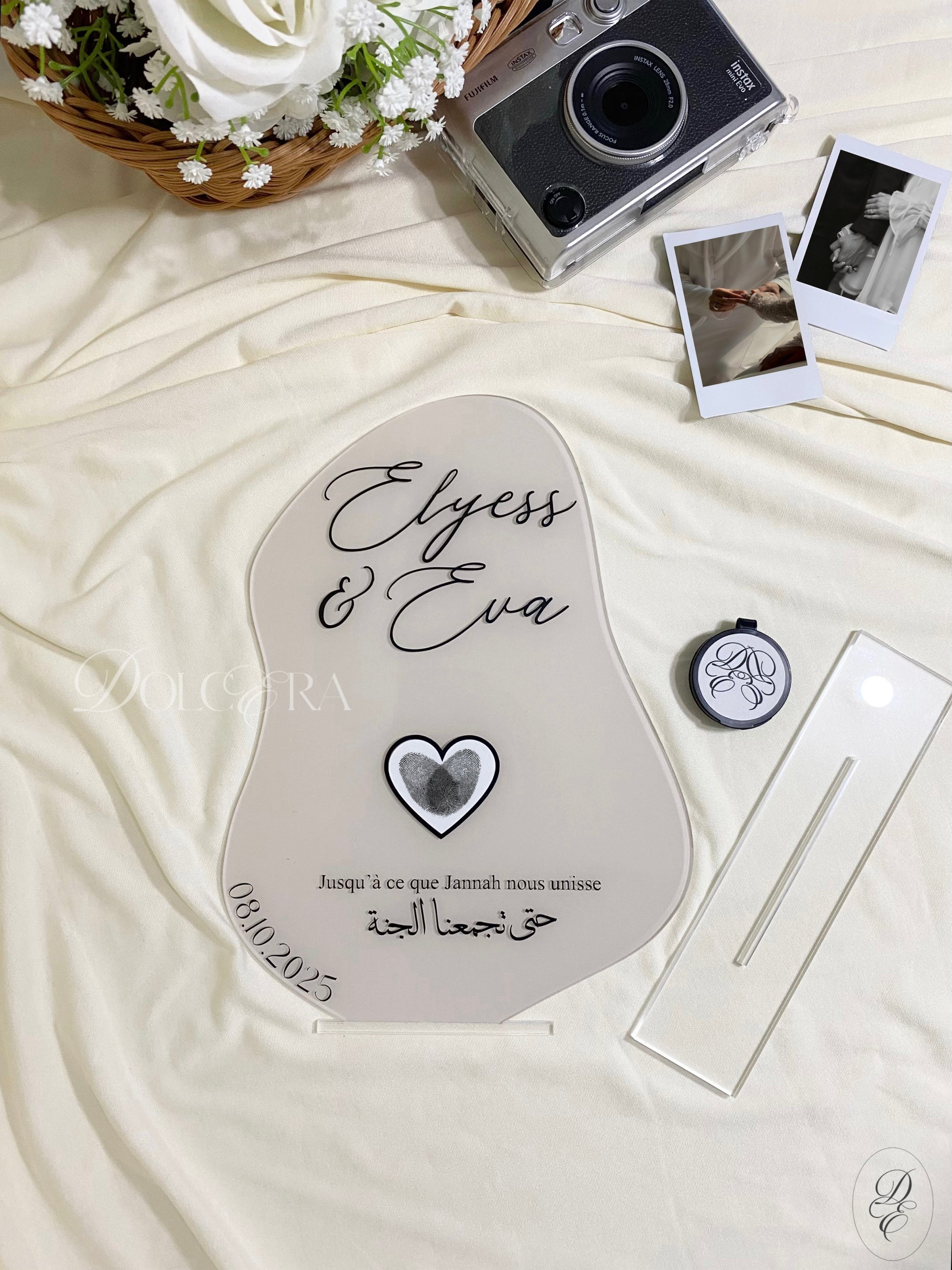 Sa forme fluide évoque une vague d’amour, tandis que les empreintes réunies en cœur représentent un lien unique, sincère et éternel.